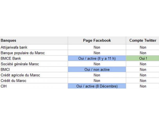 ▬▬ Les banques marocaines & les réseaux sociaux ▬▬ voici un tableau qui montre la possession d’une page Facebook et d’un compte Twitter par les différentes banques au Maroc. [Blog.Maroketing.com] ---------------------------------------------------------------- Qu'est ce que vous en pensez ???